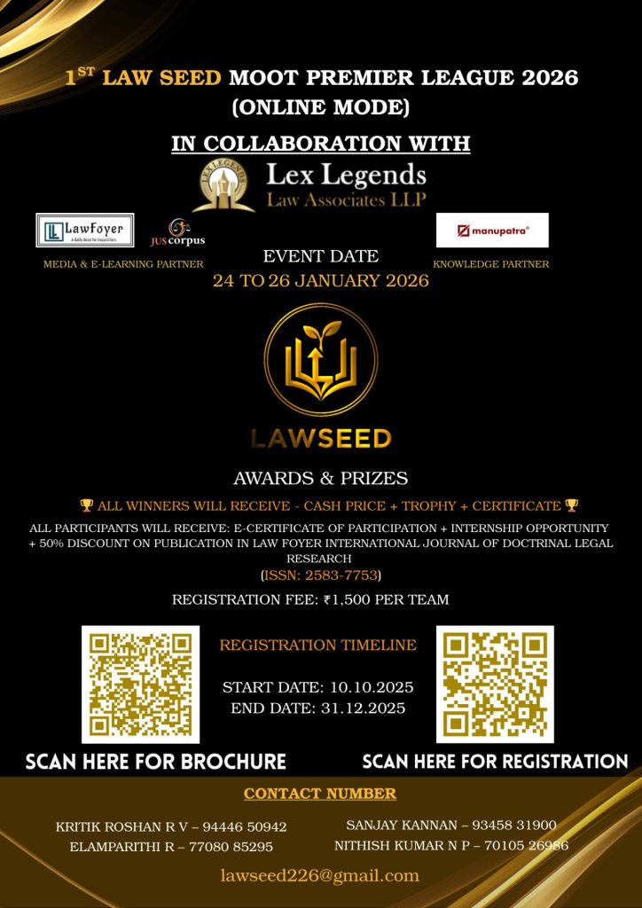 The 1ST EDITION OF LAW SEED MOOT PREMIER LEAGUE 2026, organized by law seed, is a premier platform for law students across india to showcase their research, advocacy, and oratory skills. This competition is designed to bridge the gap between legal theory and practice, allowing participants to engage in realistic court simulations and develop critical thinking, legal reasoning, and courtroom etiquette. The moot is conducted entirely online, making it accessible to students nationwide, while maintaining a high standard of professionalism and judicial rigor.