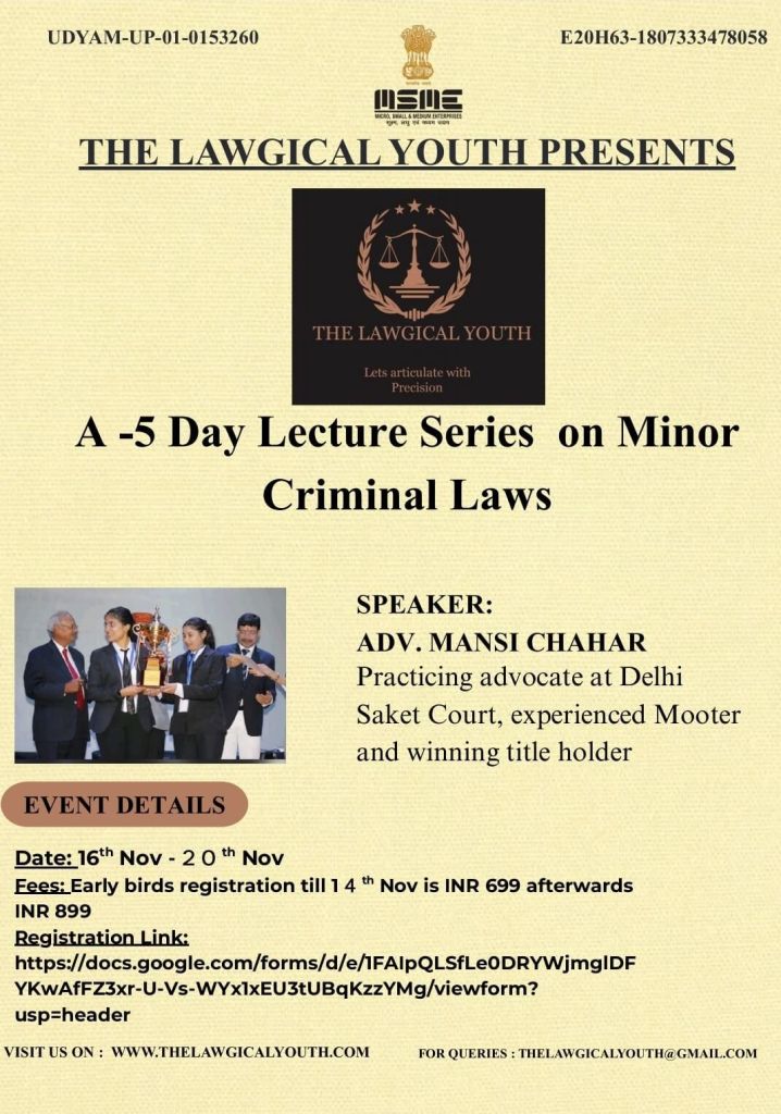 The 5-Day Lecture Series on Minor Criminal Laws, organized by The Lawgical Youth from 16th to 20th November 2025, aims to provide participants with a comprehensive understanding of legislations that protect women and address often-overlooked offences in criminal law.