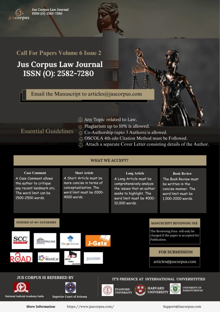 Jus Corpus Law Journal (JCLJ) is a quarterly, Double-Blind Peer-Reviewed E-Journal (ISSN: 2582-7820) that is open to students, academicians, scholars, and professionals in the law profession and allied fields to publish and read the content which is published in the form of articles, blogs, case comments, research articles, etc.