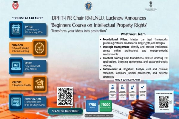 RMLNLU’s DPIIT-IPR Chair is conducting an Online Certificate Course on Intellectual Property Rights from 2nd February to 16th February 2026. This course offers a comprehensive program designed to help you master patents, trademarks, copyrights, and designs, equipping you with practical knowledge in IPR management, procedures, and real-world applications.