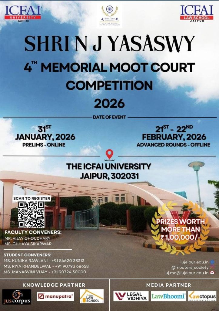 Shri N J Yasaswy 4th Memorial Moot Court Competition, 2026, scheduled to be held on 31st January 2026, Prelims- online and 21st-22nd February 2026, Advanced Rounds offline at The ICFAI University, Jaipur Campus.